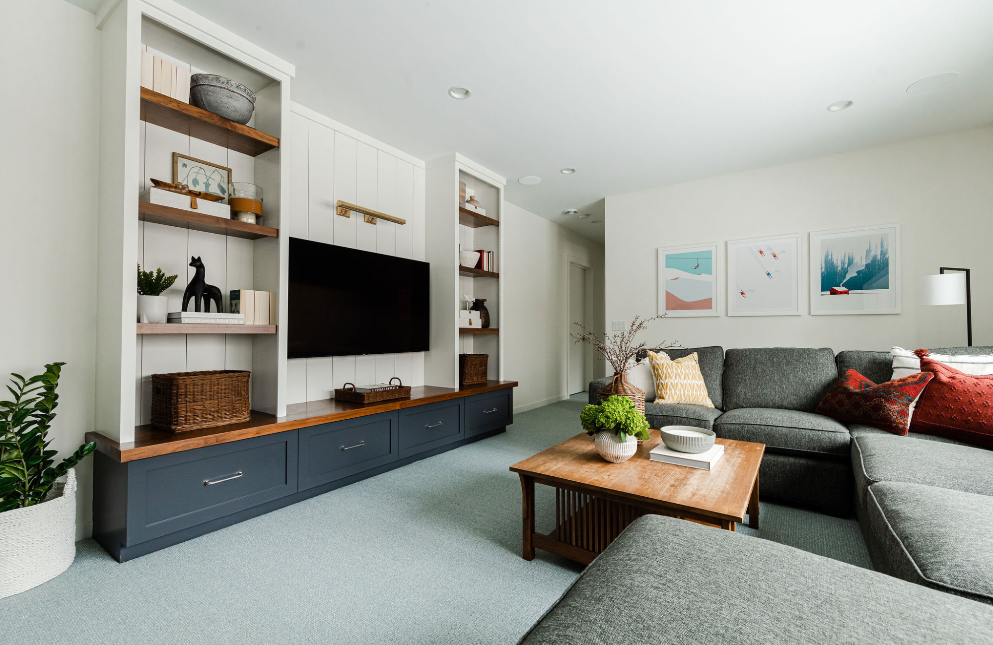 Directly across from the sectional is a sleek, built-in unit that expertly frames the TV and boasts ample practical storage. To add a touch of nautical flair, we incorporated vertical shiplap into the back wall, providing a subtle yet striking feature. Underneath, deep drawers offer ample space for Derek and Liz to store blankets and other essentials. Practical and beautiful. Win!